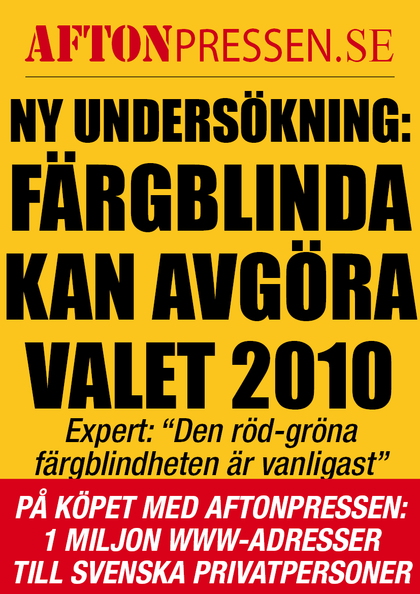 Den vanligaste formen av färgblindhet är den röd-gröna. Alltså att man inte kan skilja på rött och grönt. Hur stor påverkan detta har på valresultatet eller om det endast gör att förflyttningar sker inom det röd-gröna blocket, låter vi vara osagt. Vi spekulerar enbart i det. En socialdemokrat som föredrar att vara anonym, men vi skulle kunna kalla henne Mona, menar att detta är den enskilt största förklaringen till att socialdemokraterna tappat väljare till miljöpartiet.